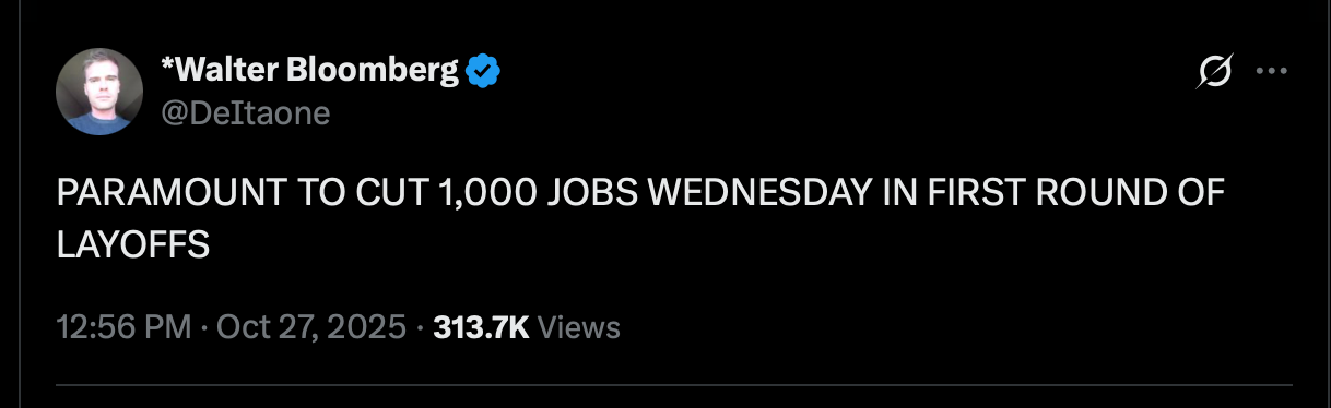 Paramount announces a thousand layoffs, and the world barely flinches; there is no uproar, only the slow, silent sinking of a name that once stood for something bigger than itself, another headline lost in the infinite scroll.